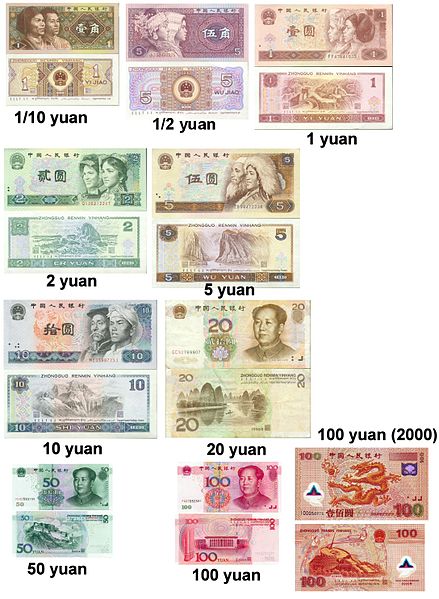 در حال حاضر اسکناسهای رایج در این کشور ۱ جیائو، ۵ جیائو، ۱ یوان، ۵ یوان، ۱۰ یوان، ۲۰ یوان، ۵۰ یوان و ۱۰۰ یوان است. بر روی اسکناسهای ۱ تا ۵۰ یوانی تصویر مائو تسهتونگ حک شده که از تاثیرگذارترین چهرههای این کشور و جهان در قرن بیستم بود. اسکناس ۱۰۰ یوانی برای اولین بار در سال ۲۰۱۵ چاپ شد و تصویر فضاپیمایی بر روی آن نشان داده شده است. |